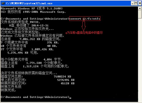 3、接著在彈出的dos管理員命令窗口中輸入“convert g:/fs:ntfs”并按回車鍵執行,然后等待u盤格式轉換ntfs即可,如果當前u盤以為ntfs格式將不會進行該任務。
