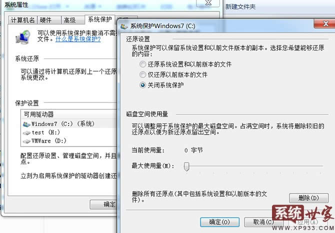 第三步、 在彈出“系統屬性”單擊“系統保護”頁面。查看C盤的還原保護是開啟狀態,并點擊“配置”。 第四步、在彈出的“系統保護本地磁盤”窗口中,我們把“還原設置”改為“關閉系統保護”,再單擊“刪除”。