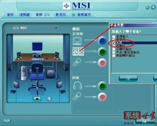 2.選擇“音頻I/O”,將后面板聲音輸出默認的“喇叭輸出”改為“耳機”這步是整個HD聲卡設置最關鍵的一步,一定不能忘。