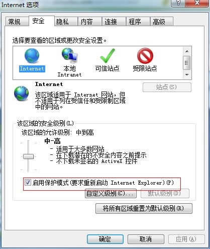 3、Internet屬性--安全--把“啟用保護模式”前面的對鉤去掉。不要管提示有風險(因為大家都安有殺毒軟件)--點確定。