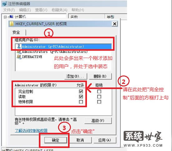 4、為注冊表“HKEY_CURRENT_USER”添加控制權限