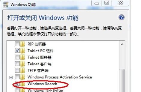 2. 在隨后打開的對(duì)話框中,找到并勾選“Windows Serach”,在最后會(huì)彈出一個(gè)對(duì)話框,然后“確定”,等上幾分鐘就行。接著點(diǎn)“開始”就能看到搜索框了。