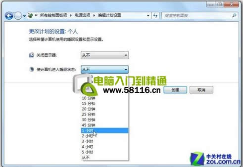 這里會要求用戶選擇關閉顯示器之前的待機時間,以及使計算機進入睡眠狀態之前的待機時間。臺式機與筆記本電腦的界面有可能不相同,但所要求用戶選擇的內容是相同的。
