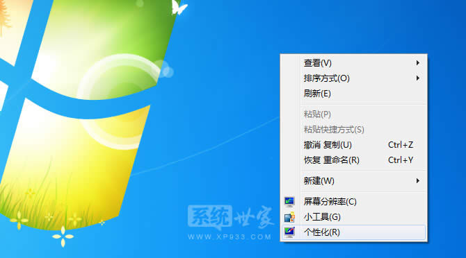 一、在windowx7的桌面隨便一個空白位置,點擊鼠標(biāo)右鍵,在彈出的菜單中,點擊進入“個性化”設(shè)置選項,如下圖所示: