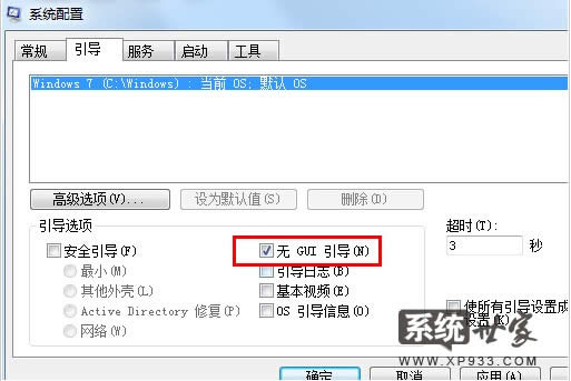在跳出來的win7系統配置窗口中,我們選擇引導的服務選項,列表中出現的選項其實就是咱們的win7開機畫面了,只需要在下面的引導選項中的“無GUI引導”前勾選上即可關閉win7的開機畫面了!
