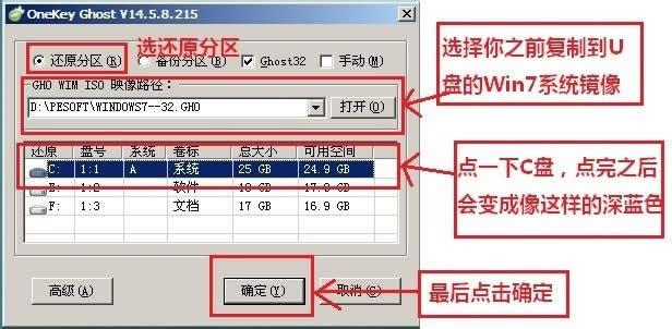 PS:別忘了把U盤插上啊,以前有個人問我說按照你的方法做的,怎么不管咋弄都不行呢,費了老大勁,最后才發現原來是他沒把U盤插上,大家注意啊。 幾乎所有的都可以按照上面方法來,如果你運氣不好上面的方法不行的話,需要通過BIOS設置來設置U盤啟動 由于不同品牌方法不一樣,這里不統一提供教程,您可以看看說明書,或者百度搜索“您的品牌(或者機型)BIOS U盤啟動”這個關鍵詞 U盤啟動之后,就會進入WinPE系統,這一步完成。 END 系統進不去怎么重裝--重裝系統通過U盤啟動后會進入WinPE系統。 打開桌面上的Onekey Ghost 接下來,在Onekey ghost選擇還原分區,在GHO WIM ISO映像路徑中選擇你之前復制到U盤里的Win7系統鏡像Windows7.GHO,然后點擊底下的C盤,如下圖