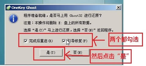 彈出來一個提示框,詢問是否進行還原,先把完成后重啟和引導修復都勾選上,然后點擊確定,如圖