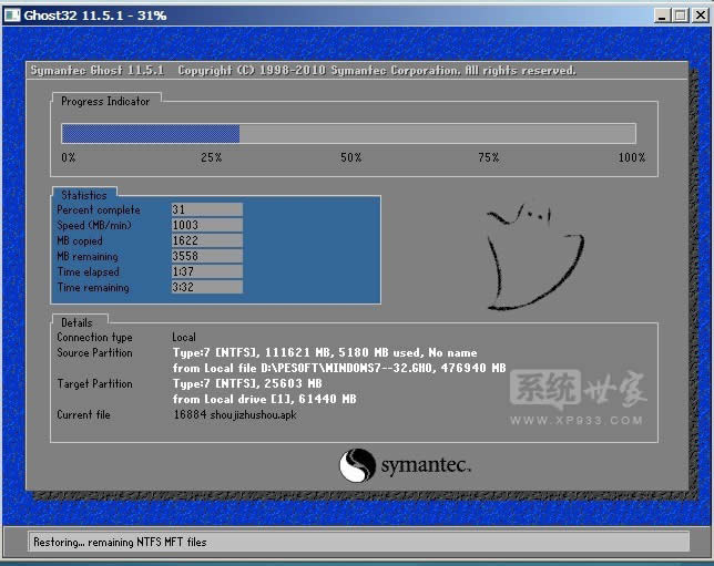 然后開始進行安裝,如下圖,稍等一會,等進度條走完,計算機會自動進行重啟