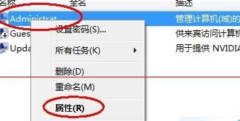 3、在右邊的細(xì)節(jié)窗口中,右擊“Administrator”,選擇“屬性”。