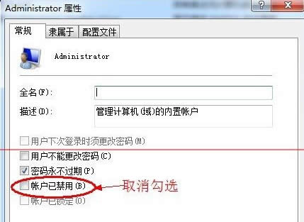 4、默認(rèn)狀態(tài)下,Administrator屬性窗口中“賬戶已禁用”項(xiàng)是勾選著的。我們需要取消其勾選,然后按“確定”保存更改