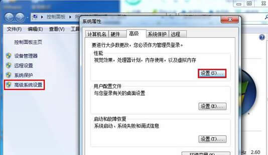 2、打開系統界面后,點擊“高級系統設置”,此時會彈出一個系統屬性設置窗口,我們點擊切換到“高級”標簽,然后點擊性能里的“設置”按鈕,如下圖所示: