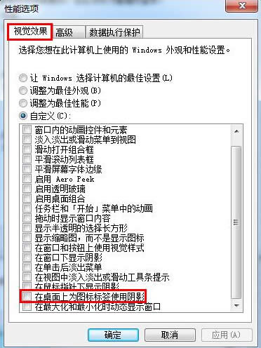 3、打開性能選項設置窗口后,切換到“視覺效果”,然后點擊“自定義”,在下拉列表中找到并將“在桌面上為圖標標簽使用陰影”前的勾選取消,最后點擊“確定”即可,如下圖所示: