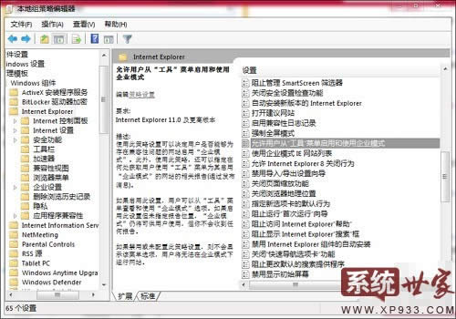 3、然后依次展開“計算機配置》管理模板》Windows組件》Internet Explorer項目”,在右側(cè)找到并雙擊“允許用戶從“工具”菜單啟用和使用企業(yè)模式”項;