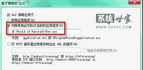 選擇將此Qos策略運用于“僅限具有此可執(zhí)行名稱的應(yīng)用程序”,然后在下面的欄中輸入魔獸世界 WOW.EXE程序的完整路徑,再點擊下一步。