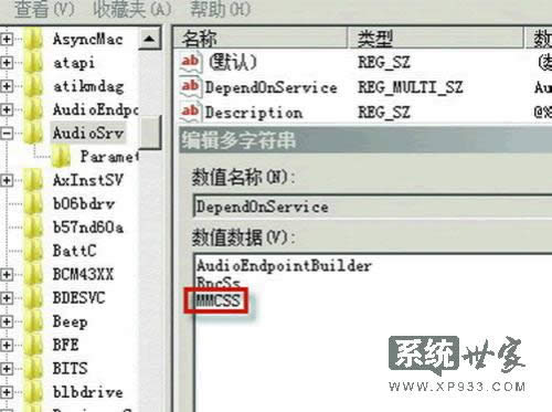 CurrentControlSet/Services/Audiosrv這個項,雙擊打開右側(cè)的DependOnService項目,把其中 的MMCSS刪除,保留另外2個,然后點擊確定,重啟電腦。然后再右鍵點擊“計算機”,在服務(wù)項中找到“Multimedia Class Scheduler”,先停止這項服務(wù),然后再將啟動類型設(shè)置為“禁用”即可。