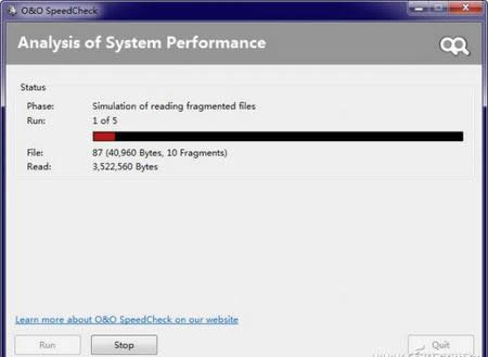 第2步:接下來軟件會模擬讀取碎片文件,為了能夠達到準確分析,這個模擬過程將會重復5次。如圖(O&OSpeedcheck.jpg),稍后的模擬磁盤整理之后的文件讀取也會被模擬5次。模擬結束后,軟件將會對比顯示磁盤整理前后的文件讀取時間,并且告訴你碎片整理將會增加多少文件讀取性能。如果顯示的性能提升較大,比如80%以上,那么建議立即進行一次碎片整理。