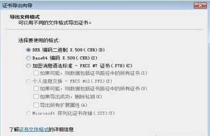 4、在“導出文件格式”界面中,選擇要使用的證書文件格式,通常無需再選擇,按照默認設置即可,如下圖示。