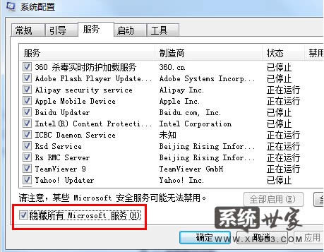 切換到服務(wù)選項(xiàng),然后將下方的隱藏所有microsoft選項(xiàng)勾選上。現(xiàn)在上面的窗口中出現(xiàn)的服務(wù)就是真實(shí)的電腦中第三方加載項(xiàng)的全部服務(wù)項(xiàng)目了,大家可以看看,哪些是不需要的,就將它刪除好了。