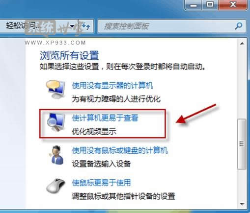 拉動滑塊到“瀏覽所有設置”。單擊“使計算機更易于查看”;