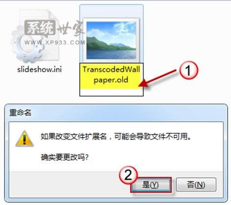 將 TranscodedWallpaper.jpg 重命名為 TranscodedWallpaper.old。(如果文件后綴名不可見,按一下“Alt+T”調出工具欄,打開“工具->文件夾選項”,在“查看”選項卡上取消勾選“隱藏已知文件的擴展名”。)
