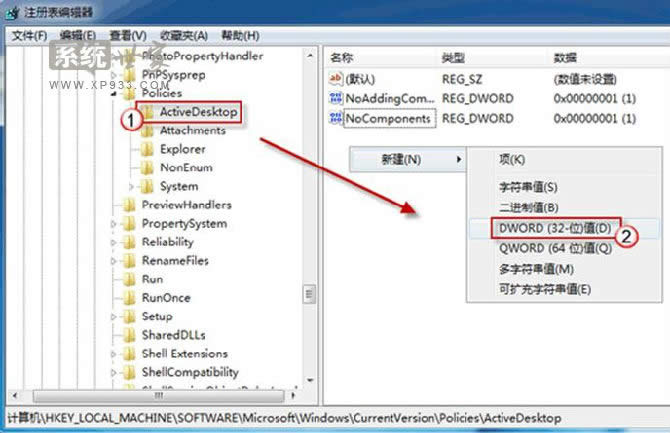 單擊展開 ActiveDesktop,在右邊細節窗口右鍵鼠標,選擇“新建->DWord 值”,命名為 NoChangingWallPaper;
