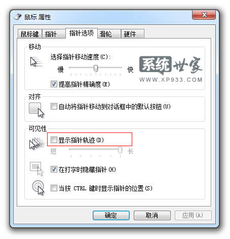 3、彈出鼠標屬性窗口,切換到“指針選項”標簽頁,在可見性中將“顯示指針軌跡”前面的勾去掉,點擊“確定”保存后退出即可。