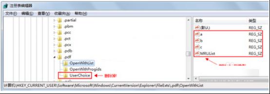 5、找到以下注冊項“HKEY_CURRENT_USER/Software/Microsoft/Windows/CurrentVersion/Explorer/FileExts/.pdf (提示:此處對應你當前的文件后綴,小編這里以 .pdf 為例)”如圖刪除“OpenWithList”下的除“(默認)”外的注冊表鍵值以及“UserChoice”。