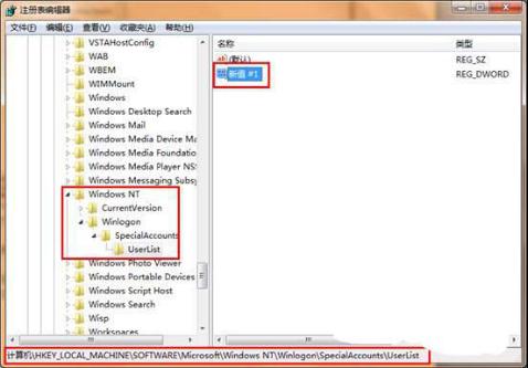 3、在“Winlogon\SpecialAccounts\UserList”注冊項右側空白處,右鍵新建一個“DWORD32位的值”。