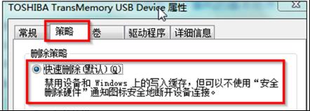 4、此時(shí)系統(tǒng)便會(huì)彈出的移動(dòng)硬盤的屬性窗口,切換到“策略”標(biāo)簽頁(yè),把它快速刪除選中,點(diǎn)擊“確定”按鈕,退出窗口即可。