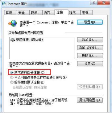 Windows 7,中文名稱視窗7,是由微軟公司(Microsoft)開發的操作系統,內核版本號為Windows NT 6.1。Windows 7可供家庭及商業工作環境:筆記本電腦 、平板電腦 、多媒體中心等使用。Windows 7可供選擇的版本有:入門版(Starter)、家庭普通版(Home Basic)、家庭高級版(Home Premium)、專業版(Professional)、企業版(Enterprise)(非零售)、旗艦版(Ultimate)。 有一朋友新購了Win7系統電腦,一打開網頁就彈出寬帶連接的窗口,很煩人,而且速度比較慢,win7系統打開網頁很慢總彈出寬帶連接提示怎么辦?其實這是由于商家為了一些用戶方便設置的,如果用戶想取消的話,請來看看以下方法吧。操作步驟: 1、打開IE瀏覽器,點擊“工具——Internet選項”。 2、在打開的Internet選項后,點擊“連接”切換到連接設置界面,選擇“從不進行撥號連接”選項,然后確定。 ![]() 通過以上設置后,以后每次上網前就需要手動連接寬帶,而不是一打開IE瀏覽器就彈出連接窗口的提示了。 windows 7 的設計主要圍繞五個重點——針對筆記本電腦的特有設計;基于應用服務的設計;用戶的個性化;視聽娛樂的優化;用戶易用性的新引擎。 跳躍列表,系統故障快速修復等,這些新功能令Windows 7成為最易用的Windows。 |