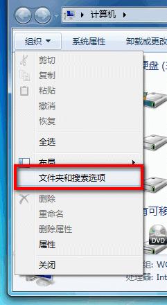 1、雙擊打開計算機,在右上角的“組織”菜單中點擊選擇“文件夾和搜索選項”。