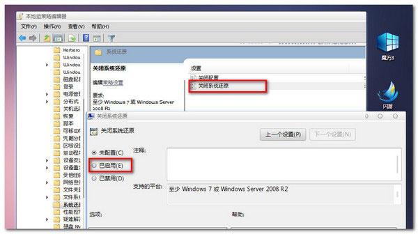 2、 依次點(diǎn)擊打開“計(jì)算機(jī)配置→管理模板→系統(tǒng)→系統(tǒng)還原”,在右側(cè)面板中雙擊“關(guān)閉系統(tǒng)還原”,設(shè)為“已啟用”來實(shí)現(xiàn)關(guān)閉系統(tǒng)還原的操作。