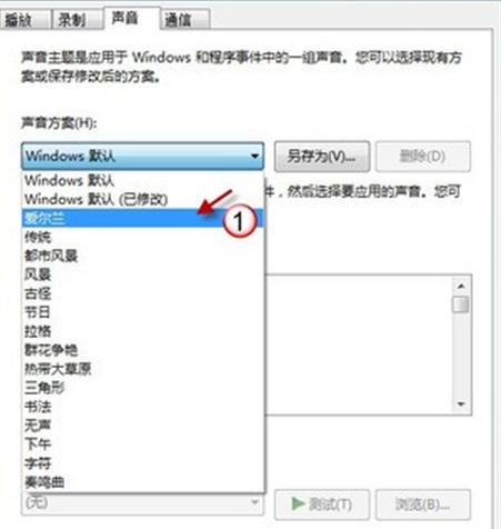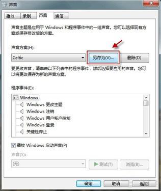 3、此時(shí)可以發(fā)現(xiàn),當(dāng)前“愛(ài)爾蘭”主題的聲音方案為“Celtic”,單擊 “另存為” 按鈕,將這個(gè)聲音方案另外保存。