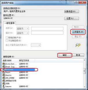 5、在右邊窗口中點(diǎn)擊“立即查找”,這個(gè)時(shí)候底部會(huì)出現(xiàn)查找的選項(xiàng),找到并選中“everyone”后點(diǎn)擊“確定”按鈕。