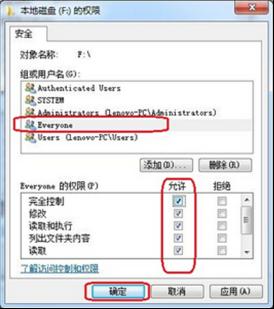 7、返回到F盤的權(quán)限窗口中,在組或用戶名中選擇“everyone”,并在“完全控制”前面打勾,最后單擊確定即可!