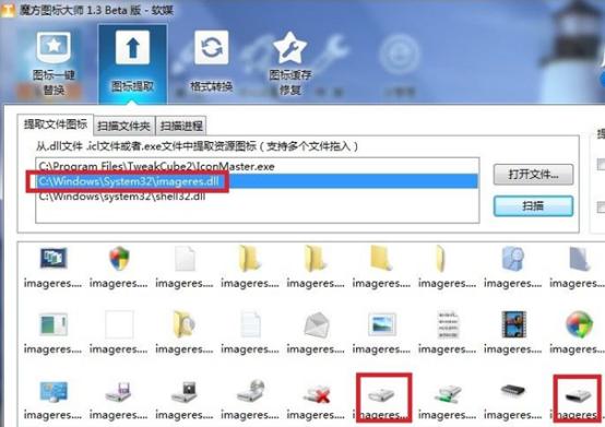 1、提取正常的Win7系統(tǒng)圖標ico文件:可通過任意圖標提取工具進行提取,小編在此以魔方給大家演示,通過“掃描”Windows系統(tǒng)文件夾System32中的imageres.dll文件,然后從中提取圖標。