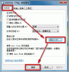 2、彈出“任務欄和 [開始 ]菜單屬性”窗口,點擊“任務欄” --“自定義” --“確定”;