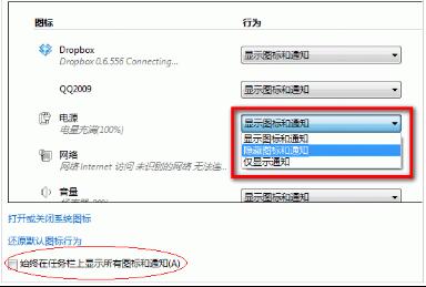 3、彈出的自定義窗口中,右側選擇“顯示圖標和通知”,“隱藏圖標和通知”或“僅顯示通知”后點擊確定即可。