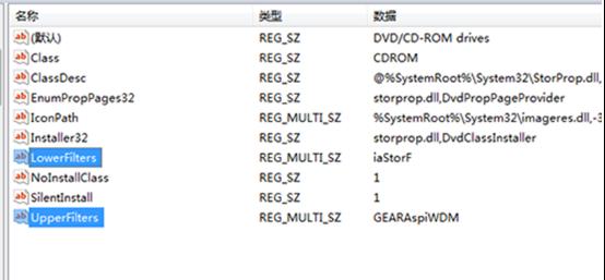 3.在{4D36E965-E325-11CE-BFC1-08002BE10318}項(xiàng)的右側(cè)列表中找到并刪除"UpperFilters"與"LowerFilters"這兩項(xiàng)即可解決以上問題了。