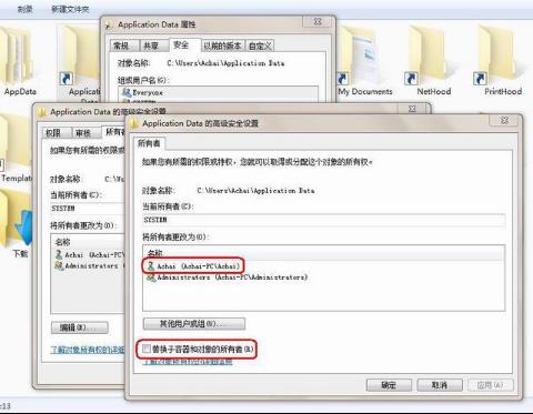3、在彈出的所有者設(shè)置窗口中雙擊用戶賬號(hào)“Achai”,然后在“替換子容器和對(duì)象的所有者”的前面打勾,點(diǎn)擊“應(yīng)用、確定”。