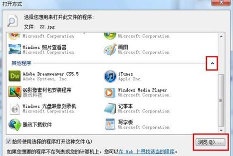3、如果該程序在“推薦的程序”列表中沒有列出,可以點擊下方“其它程序”右側(cè)的黑色小箭頭繼續(xù)查找,如果還是找不到,則點擊下窗口右下角的“瀏覽”來進(jìn)行目錄查找。