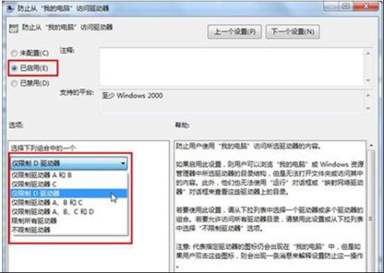 | Windows 7,中文名稱視窗7,是由微軟公司(Microsoft)開發的操作系統,內核版本號為Windows NT 6.1。Windows 7可供家庭及商業工作環境:筆記本電腦 、平板電腦 、多媒體中心等使用。Windows 7可供選擇的版本有:入門版(Starter)、家庭普通版(Home Basic)、家庭高級版(Home Premium)、專業版(Professional)、企業版(Enterprise)(非零售)、旗艦版(Ultimate)。 Windows7系統保護磁盤信息安全,有一種鎖定磁盤最簡單的方法科是使用“組策略”工具,把存放隱私資料的硬盤分區設置為不可訪問,雖然它的安全性比不上Win7系統自帶的BitLocker功能,但是它的,操作過程要簡單很多。感興趣的用戶趕快來看看鎖定新蘿卜家園Win7磁盤的方法吧。1、在開始菜單底部的搜索框中輸入“gpedit.msc”命令后按回車,打開“本地組策略編輯器”。 2、在打開的組策略編輯器左側導航中依次找到“用戶配置——管理模板——Windows組件——Windows資源管理器”。 3、在右側窗口列表中找到并雙擊“防止從‘電腦’訪問驅動器”。 ![]() 4、在打開的對話框中,將“未配置”改為“已啟用”,然后在下方的選項下拉列表中選擇需要限制的磁盤。 設置完成后,保存退出組策略,再打開“計算機”,雙擊剛才限制的驅動器,系統就會出現“本次操作由于這臺計算機的限制而被取消。請與您的系統管理員聯絡”的提示框。 windows 7 的設計主要圍繞五個重點——針對筆記本電腦的特有設計;基于應用服務的設計;用戶的個性化;視聽娛樂的優化;用戶易用性的新引擎。 跳躍列表,系統故障快速修復等,這些新功能令Windows 7成為最易用的Windows。 |