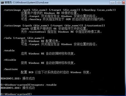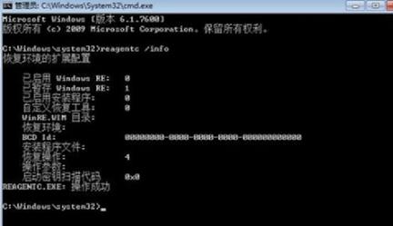 2、確定 Windows RE 為禁用狀態(tài)之后,鍵入“reagentc /enable”命令行后按回車鍵,來重新啟用 Windows RE。如果命令執(zhí)行成功會獲得“REAGENTC.EXE: 操作成功”的信息提示。
