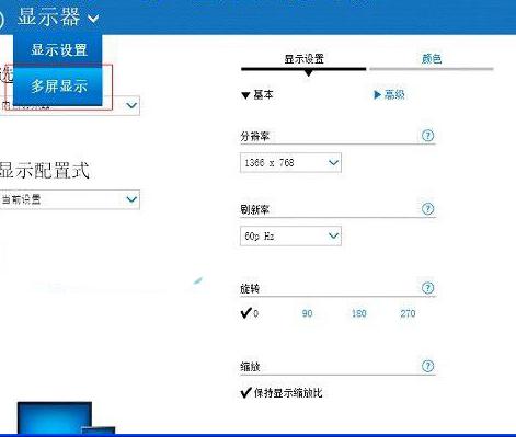 4、點(diǎn)擊顯示器,在下拉菜單中選擇多屏顯示,實(shí)現(xiàn)投影儀切換選項;