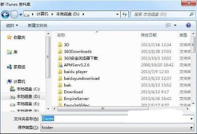2、此時彈出一個新iTunes資料庫創(chuàng)建窗口,選擇需要創(chuàng)建的iTunes資料存放地方,比如D盤,文件夾名稱命名為“iTunes”,保存類型設(shè)為“folder”,然后點擊保存;