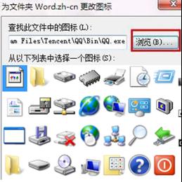 2、接著可以看到系統(tǒng)已提供了不少圖標(biāo),選擇自己喜歡的就OK了。如果覺得系統(tǒng)自帶的不好看,也可使用自己的圖標(biāo):點(diǎn)擊“瀏覽”,找到自己保存的圖標(biāo)或者應(yīng)用程序,確定即可。