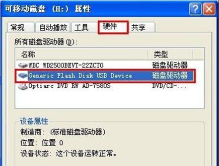 2、在彈出的屬性對(duì)話框中,切換到“硬件”標(biāo)簽頁(yè),在“所有磁盤驅(qū)動(dòng)器”中選擇使用的U盤,然后點(diǎn)擊“屬性”按鈕。