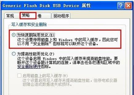 3、在彈出的屬性窗口中,切換到“策略”標(biāo)簽頁(yè),選擇“為快速刪除而優(yōu)化”,然后點(diǎn)擊“確定”即可。