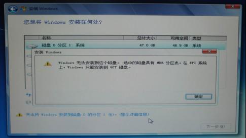 | Windows 7,中文名稱視窗7,是由微軟公司(Microsoft)開發(fā)的操作系統(tǒng),內(nèi)核版本號為Windows NT 6.1。Windows 7可供家庭及商業(yè)工作環(huán)境:筆記本電腦 、平板電腦 、多媒體中心等使用。Windows 7可供選擇的版本有:入門版(Starter)、家庭普通版(Home Basic)、家庭高級版(Home Premium)、專業(yè)版(Professional)、企業(yè)版(Enterprise)(非零售)、旗艦版(Ultimate)。 有用戶在安裝Win7 64位系統(tǒng)時,安裝到磁盤分區(qū)界面時就無法繼續(xù)了,出現(xiàn)了“Windows 無法安裝到這個磁盤,選中的磁盤具有MBR分區(qū)表。在 EFI 系統(tǒng)上,Windows 只能安裝到 GPT 磁盤。”的提示,安裝大地Win764位系統(tǒng)時卡在MBR分區(qū)中怎么辦?下面小編給大家作出如下解析。