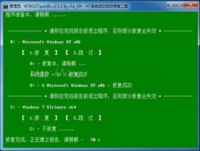 | Windows 7,中文名稱視窗7,是由微軟公司(Microsoft)開發的操作系統,內核版本號為Windows NT 6.1。Windows 7可供家庭及商業工作環境:筆記本電腦 、平板電腦 、多媒體中心等使用。Windows 7可供選擇的版本有:入門版(Starter)、家庭普通版(Home Basic)、家庭高級版(Home Premium)、專業版(Professional)、企業版(Enterprise)(非零售)、旗艦版(Ultimate)。 一些用戶在Windows7系統下安裝xp系統后,遇到了這樣一個問題,重啟后直接進入系統,沒有選擇啟動菜單,怎么解決呢?為了幫助用戶快速解決這個問題,現小編給大家介紹在系統之家windows7下安裝xp后重啟沒有選擇啟動菜單的應對手段,具體如下:一、準備工作: 下載NTBOOT2.5.7軟件 二、操作步驟: 1、在NTBOOT2.5.7版本軟件上右擊選擇以管理員身份打開,在打開的窗口中手動修復,在彈出提示修復windows xp x86啟動項,點擊“修復”項; 2、然后在跳到windows7 ultimate 啟動項窗口中選擇“跳過”項; 3、彈出的窗口界面中選擇跳過。 通過以上設置后,重新啟動系統后,就會出現選擇啟動菜單了。 windows 7 的設計主要圍繞五個重點——針對筆記本電腦的特有設計;基于應用服務的設計;用戶的個性化;視聽娛樂的優化;用戶易用性的新引擎。 跳躍列表,系統故障快速修復等,這些新功能令Windows 7成為最易用的Windows。 |